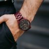 La montre en bois Jerico est conçue et produite par des horlogers professionnels au Luxembourg. Il fait 45 mm de diamètre avec une bande de 22 mm. Il suit un mouvement Citizen et il a un boîtier en verre minéral durci. La montre en bois est résistante aux éclaboussures.